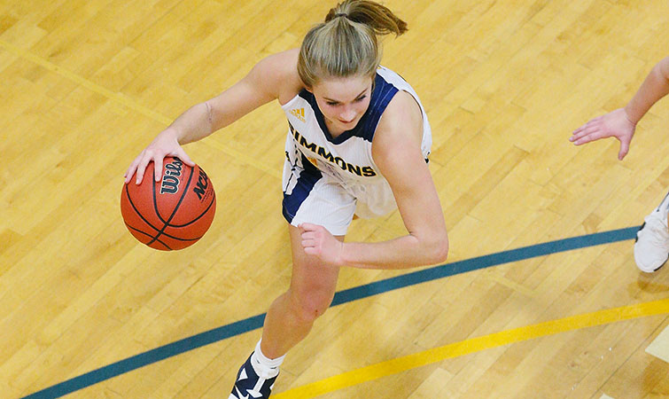 Simmons got off to a quick start and led 11-8 on a three-pointer by Jen Janiak (Chelmsford, Mass.), 6:58 into the game. The Blue Jays then went on a 13-0 run that included three transition layups to lead 21-11 with 9:44 to play in the half. Shauna Sullivan, Diliberto and Hyde (one three-pointer) each had two baskets in the run.
