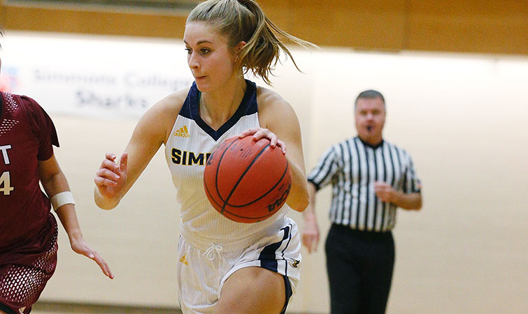 USJ led 41-30 at halftime, but Simmons came back within 41-35 on two free throws from O'Connor a minute into the second half. The Sharks stayed close until the final 10 minutes. Two more O'Connor free throws got Simmons within 57-49 with 11:26 remaining, but nine unanswered points, six by Diliberto, put USJ up 66-49 with 8:56 to play and the Blue Jays cruised to the victory.