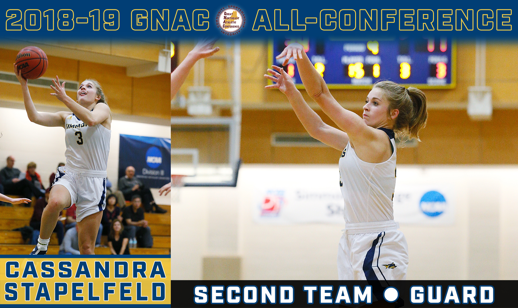Liz O'Connor (Milton, Mass.) led Simmons with 19 points and 12 rebounds and Hannah May (Hamden, Conn.) had 11 points and eight boards. Mary Hyde had 16 points, six rebounds, five assists and four steals for the Blue Jays. Heather Framski had 13 points and six rebounds.